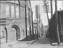 By 1850, 900 free blacks, making up 12% of the city's population lived in Harrisburg. Residents of the ally were more likely to be the poorest residents.[3] Churches, restaurants, dance halls, and business were also in the Tanner's Alley.[1] The Wesley Union African Methodist Episcopal Zion Church, founded in 1816, was located there, as well as other Underground Railroad stations in the homes of free black men and women. The Black Masonic Hall was also located there.[5][3]