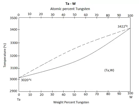 The equilibrium phase diagram of the alloy formed between the two components Tantalum and tungsten is a binary diagram, where the two components are totally soluble on each other. In this diagram the melting temperature of the two elements are shown. It can be seen that there are two lines, representing the solidus and liquidus.[3]