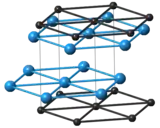 TaCx compounds have a cubic (rock-salt) crystal structure for x = 0.7–1.0;[14] the lattice parameter increases with x.[15] TaC0.5 has two major crystalline forms. The more stable one has an anti-cadmium iodide-type trigonal structure, which transforms upon heating to about 2,000 °C into a hexagonal lattice with no long-range order for the carbon atoms.[10]