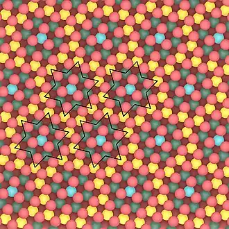 In the 1T phase, selenium atoms show an octahedral symmetry[5] and the relative orientation of the selenium atoms in the topmost and bottommost layers is opposed. On a macroscopic scale, the sample shows a gold colour.[4] The lattice parameters are a = b = 3.48 Å,[5] while c = 0.627 nm.[4] Depending on the temperature, it shows different types of charge density waves (CDW): an incommensurate CDW (ICDW) between 600 K and 473 K[4] and a commensurate CDW (CCDW) below 473 K,.[4] In the commensurate CDW, the resulting superlattice shows a reconstruction[6] often addressed as star of David (SOD),[6] with respect to the lattice parameter (a = b) of non distorted TaSe2 (above 600 K). Film thickness can influence as well the CDW transition temperature: the thinner the film, the lower the transition temperature from ICDW to CCDW.[4]