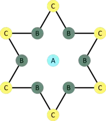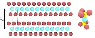 The 2H phase is based on a configuration of selenium atoms characterized by a trigonal prismatic symmetry[5] and an equal relative orientation in the topmost and bottommost layers. The lattice parameters are a = b = 3.43 Å,[5][7] while c = 1.27 nm.[7] Depending on the temperature, it shows different types of charge density wave: an incommensurate CDW (ICDW) between 122 K and 90 K and a commensurate CDW (CCDW) below 90 K.[4][8] The lattice distortion below 90 K gives rise to a CCDW that makes a 3 × 3 reconstruction[9] with respect to the non-distorted lattice parameter (a = b) of 2H TaSe2 (above 122 K).