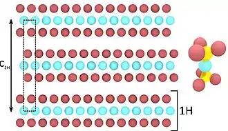 In the 2H phase the single trilayers are stacked one opposed to others, as shown in the relative image. Through molecular beam epitaxy it is possible to grow one single trilayer of 2H TaSe2, also known as 1H phase. Basically, the 2H phase can be seen as the stacking of 1H phase with opposed relative orientation with respect to each others.[5]