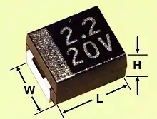 An overview of the dimensions of conventional tantalum rectangular chip capacitors and their coding is shown in the following table:[15]