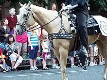 A tapadero, sometimes referred to as a "hooded stirrup," is a leather cover over the front of a stirrup on a saddle that closes each stirrup from the front. A tapadero prevents the rider's boot from slipping through and also prevents brush encountered while working cattle on the open range from poking through the stirrup, injuring or impeding the horse or rider. Some designs can also provide protection in cold weather. They are also frequently used with young riders, as many parents and riding instructors feel they are a safety precaution. Most commonly seen today on a western saddle, particularly certain types of children's saddles and parade horse saddles, the tapadero is not common in modern times and is not allowed in most show competition other than Parade Horse competition and children's leadline.