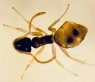 The ghost ant is small, with average lengths ranging between 1.3 to 2.0 millimetres (0.051 to 0.079 in) in workers.[1] The antennae composes of 12 segments that thickens towards the tip.[2] The antennal scapes exceeds the occipital border. The head and thorax is a dark brown colour while the gaster, legs and antennae are a milky white colour.[2][1] Due to its small size and light colour, the ghost ant is difficult to see.[3] Ghost ants are monomorphic and the thorax is spineless.[2] The gaster is hairless, and has a back opening that is similar to a slit-like opening.[3] The abdominal pedicel is formed upon a single segment that is usually unable to be seen due to the gaster, and the species do not contain a stinger.[2] During development, this species undergoes three larval instars, which are all naked and fusiform, with reduced mouthparts.[4]