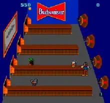 Originally sponsored by Anheuser-Busch, the arcade version features a Budweiser motif.[7] It was intended to be sold to bars, with cabinets sporting a brass rail footrest and drink holders. Early machines had game controllers that were actual Budweiser beer tap handles, which were later replaced by smaller, plastic versions with the Budweiser logo on them.[8] The re-themed Root Beer Tapper followed in 1984, which was developed specifically for arcades because the original version was construed as advertising alcohol to minors.