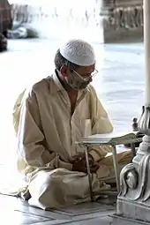 The Taqiyah (Arabic: طاقية, ALA-LC: ṭāqīyah[note 1]), also known as tagiyah or araqchin (Persian: عرقچین) is a short, rounded skullcap. It is often worn for cultural or religious purposes; for example, some Muslims believe that the Islamic prophet Muhammad used to keep his head covered, therefore making it mustahabb (i.e., it is commendable to cover the head in order to emulate him).[1] Muslim men often wear them during the daily prayers.