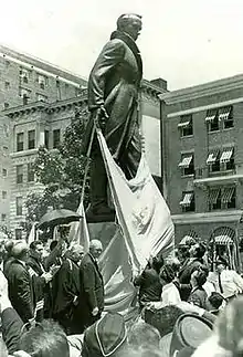 The ceremony was opened by Dobriansky followed by a rendition of the U.S. national anthem, "The Star-Spangled Banner". Senyshyn then read the invocation in English and Ukrainian and Roman Smal-Stocki, president of the memorial committee, spoke about the significance of the monument.[20] Perhaps the most prominent attendee was former U.S. President Eisenhower, who was chosen to unveil the statue.[3] Before he did so, Eisenhower was cheered for several minutes as the crowd chanted "We Like Ike!" Following a 12-minute speech, Eisenhower unveiled the statue, calling Shevchenko a Ukrainian hero and stated: "For my hope is that your magnificent march from the shadow of the Washington Monument to the foot of the statue of Shevchenko will here kindle a new world movement in the hearts, minds, words and actions of men; a never-ending movement dedicated to the independence and freedom of peoples of all captive nations of the entire world."[4] He also said the statue represented "millions of oppressed" in Eastern Europe and "gives them constant encouragement to struggle forever against Communist tyranny, until, one day final victory is achieved, as it most surely will be."[18] Following the unveiling, the Ukrainian Choral Societies of America led the crowd in a musical rendition of Shevchenko's poem Testament. Additional speeches were then made by several U.S. Representatives and Archbishop Ioan Theodorovych of the Ukrainian Orthodox Church gave the benediction. The ceremony concluded with the crowd singing Ukraine's national anthem, Shche ne vmerla Ukraina (English: Ukraine Has Not Yet Died).[20]