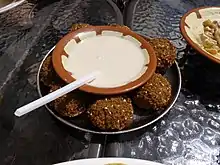 In Levantine cuisine, tarator (Arabic: طراطور) is a sauce made from tahini, lemon juice, ground garlic, salt, and water.[1][2] It is often served with falafels or beef shawarma.