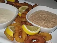 In Turkish cuisine, tarator is a sauce made from walnuts, bread, lemon juice or vinegar, ground garlic, and olive oil. It is often served with fried calamari.