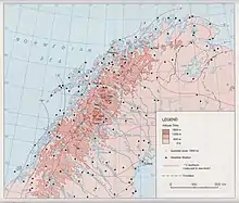 The studies were enlarged to the areas north of Tarfala (Abisko region, Lyngen Peninsula in Norway). Additional studies covered the mountain ranges in the south of the Scandinavian mountain range (Jotunheimen, Rondane, Dovre). The resulting habilitation thesis was dedicated to the memory of Valter Schytt.[14] A summary of the results was printed in Geografiska Annaler.[15] Thus, Tarfala station is located inmidst of the discontinuous permafrost zone, with a MAAT of -3.5 °C at 1130 m. At 1600 m a.s.l. the continuous permafrost zone will be reached.