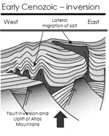 With the beginning of the Atlas Mountains orogeny and basin inversion, the salt domes and diapirs experienced lateral migration due to compression. This lateral migration deformed the salt, leading to the development of diapirs consisting of wide canopy-shaped tops.[3]