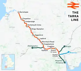 The Tarka Line, also known as the North Devon Line,[1] is a local railway line in Devon, England, linking the city of Exeter with the town of Barnstaple via a number of local villages, operated by Great Western Railway (GWR). The line opened in 1851 from Exeter to Crediton and in 1854 the line was completed through to Barnstaple. The line was taken over by the London and South Western Railway (LSWR) in 1865 and later became part of the Southern Railway and then British Rail. In 2001, following privatisation, Wessex Trains introduced the name Tarka Line after the eponymous character in Henry Williamson's book Tarka the Otter. The line was transferred to First Great Western in 2006.
