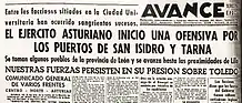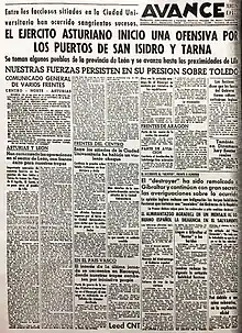 They enacted several attempts to recover Oviedo. The strongest attack took place on October 8, 1936, which encircled the town itself: fighting street by street, but they failed to take control of the city. Finally, the Francoists managed to establish a "corridor" through Grado and conquer Oviedo on the 17th. The Republicans tried to cut this "corridor" on several occasions, with 50,000 men, which included their aviation and a large part of their artillery.[21] The struggle through the "Corridor of Grado", stopped and resumed three times, consuming enormous efforts on both sides.
