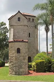 The structure is called the Tarragona Tower (a.k.a. Tarragona Arch or Tarragona Castle) was designed by the Florida architect Elias F. De La Haye. It was built from local coquina rock of irregular shapes (all of the rock used was quarried from the nearby Tomoka quarry which was owned by Charles Ballough.) Approximately 4,000 cubic yards of coquina rock, 1,000 bags of cement mix, 1,800 feet of imported Spanish roofing tiles and imported Spanish flooring tiles were used in the construction. Its interior artwork is attributed to noted Volusia County, Florida artist Don J. Emery. The structure's design was inspired by an octagonal medieval tower and arches located in Tarragona, Spain. Its construction was completed in 1925 during the Florida Land Boom by prominent Volusia County builder Charles Ballough who often utilized native coquina rock in his projects. It originally had a double arch, one on each side of the tower which is 45 feet tall. The identical arches measure 40 feet high and are 150 feet in length and extend at forty-five degree angles from the central tower. The solid coquina rock walls vary in thickness from 18 inches up to 4 feet and include several narrow window openings of various sizes that are located at different levels around the structure. The 24 feet wide arches originally spanned across two streets: Tarragona Way and Volusia Avenue (now International Speedway Boulevard), and actually had motorized traffic driving underneath).[2] [3][4]