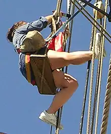 Hemp rope is treated with Stockholm tar, sometimes mixed with coal tar. Most is applied in situ (commonly while the ship is at sea); some parts of the rigging may be slacked off, or upper masts may be sent down to improve access. To access stays and backstays, a seaman is lowered slowly down the stay on a gantline[lower-alpha 1] that is fastened loosely to the stay with a bowline. The seaman applies the tar from a bucket as he goes down. The gantline is tended by someone on deck. The shrouds can be tarred from the ratlines, sometimes combined with fitting new ratlines or re-seizing the existing ones. Lee rigging is typically worked on underway, as drips or spilt tar usually fall into the sea rather than on deck.