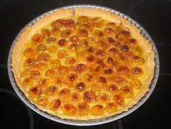 The type of pastry used for tarte aux mirabelles varies. The most frequently mentioned in recipes is pâte brisée,[5][6] but other sweet pastries – pâte sablée and pâte sucrée – are specified by some cooks,[7][8][9] and unsweetened shortcrust and puff are also used in some recipes.[10][11] In Beaulieu-sur-Dordogne, Elizabeth David encountered a tarte aux mirabelles made with yeast pastry: "Those little round golden plums of early autumn on their light brioche-like base made an unexpected and memorable end to our outdoor feast".[4]