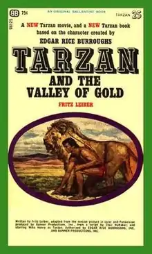 The Edgar Rice Burroughs estate chose Fritz Leiber to write an authorised novel based on Huffaker's screenplay. Leiber's novel was released in paperback by Ballantine Books in April 1966,[4] and features an expanded version of the film's story with footnotes detailing connections to Tarzan's past adventures as chronicled by Burroughs.[1] An ebook edition was issued by Gateway/Orion in August 2013, and a hardcover edition illustrated by Richard Hescox by Edgar Rice Burroughs, Inc. in August 2019.[4]