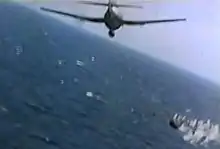 Complications set in during the filming of Task Force as consecutively, four separate crews were at work with the resultant task of merging all of the live action and archival footage. One of the near disasters involved a delivery truck that caught on fire with its load of cut and stock film along with daily rushes, personal baggage and makeup destroyed. More serious was a series of accidents involving the star, who had already expressed reservation both about the script and his perceived inadequacies as an actor.[9] In December 1948, Cooper was on a navy barge that broke down in fog, and began to take on water, almost foundering on the rocks in Long Beach harbor before he was rescued by a navy ship. Cooper was subsequently hospitalized with a high fever.[12] He was nearly seriously injured on another occasion. During gunnery practice, when Cooper was on USS Antietam, an unmanned target aircraft was hit and caught fire, heading for the crowded deck where all of the actors and crew were standing before skimming overhead, and crashing in the ocean.[9] Wayne Morris who portrayed Lt. McKinney was the only actual carrier pilot in the cast and served on the USS Essex, becoming an "Ace" by shooting down 7 Japanese planes and assisting in the sinking of 5 Japanese ships.