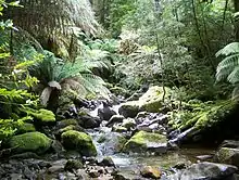 Rainforest communities in Australia are classified as closed forests in which the canopy comprises 70–100% cover.[3] It can be divided into tropical, subtropical, monsoon and temperate rainforest. Tasmanian rainforest is classified and as cool temperate rainforest, it represents the most floristically complex and best developed form of this forest type in Australia.[4] In Tasmania, they can be found in the West, Savage River National Park, South West, North East and in patches on the East Coast.[3] On the mainland of Australia, cool temperate rainforest have a wide variety of woodland trees, but Tasmania only has a limited number of woodland and vascular plants such as mosses, liverworts, lichen and fungi.[5] Because of this, the definition of Tasmanian cool temperate rainforest was redefined in the 1980s to allow for communities that did not meet the canopy requirements and clearly separate cool temperate rainforest from mixed forest; The current definition states that cool temperate rainforests are those with trees usually greater than 8 m (26 ft) in height and capable of regenerating in the absence of large scale catastrophic events, such as fire.[3] These forests are climax vegetation and are dominated by angiosperms such as Nothofagus cunninghamii (myrtle beech), Atherosperma moschatum (sassafras), and Eucryphia lucida (leatherwood) as well as gymnosperms such as Athrotaxis selaginoides (King Billy Pine), Lagarostrobos franklinii (huon or macquarie pine) and Phyllocladus aspleniifolius (celery-top pine).[6] The limited number of woody species is thought to be due to repeated glaciation.[7][8]