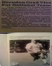 Tasos Vatikiotis (born March 20, 1977) is a former professional soccer player who played with Ethnikos Asteras Football Club, a 1st division professional team at the time (1998-1999), in Athens, Greece and USL's Delaware Wizards in (1997-1998), which was D.C. United's farm team at the time.[1] He played at the top 20 nationally ranked soccer program at Loyola University Maryland from 1994-1998.[2][3][4] Prior to college, Vatikiotis played club ball with nationally ranked VISTA Blackwatch and Springfield Nationals where he led both clubs in scoring. He finished the 1993-1994 season as the overall leading goal scorer for both the NCSL's Elite Division 1 League and Virginia's State Cup tournament, which is part of the US Youth Soccer National Championship Series. Vatikiotis was coached, among others, by Michael Brady, Rob Olson, Peter Mehlert, Evangelos Stoyas and Alketas Panagoulias. In his youth and high school days, he also trained and played under John Kerr, Sr., John Kerr, Jr. and Bruce Murray for DC based Fairfax Spartans that had recently won the National Amateur Cup. His father also played an integral part in his overall training growing up. Vatikiotis played attacking central midfield and forward.