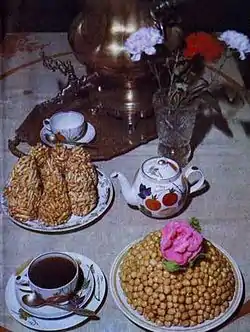 The Tatar cuisine offers a variety of baked sweets, usually served with tea: çelpek (deep-fried pancakes), qatlama (a baked roll with a variety of fillings – poppy seeds, sesame seeds, qort, nuts), qoş tele ("bird's tongue", deep-fried squares or diamonds of unleavened dough), lawaş (fried dumplings filled with raisins), paştet (sweet pies filled with jam or dried fruits) etc. Çäkçäk (chakchak, chak-chak, or chek-chek) is a mound of honey-drenched sweet pastry balls, common among all Turkic peoples. It used to be a ceremonial food brought by the bride to the reception at the bridegroom's home. Today it is a common sweet. Honey is very popular in baking and on its own, served with tea.