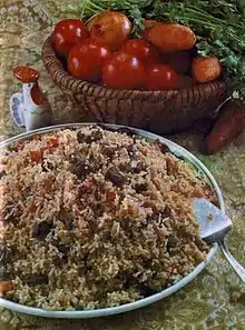 Bäliş is the oldest traditional dish combining meat and grains. Pieces of fat meat (mutton, beef, goose, or goose and duck innards) are combined with grains (millet, spelt, rice) and baked in a crock. Tutırma, an intestine filled with finely cut or chopped liver and millet or rice, is another combination of meat and grains.