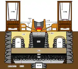 In the Middle Ages, furnaces were enlarged to produce more steel of higher quality, and underground facilities were also huge and complicated to keep the furnace warm and reduce humidity. In addition, a new method of collecting ironsand, called kanna nagashi (鉄穴流), which can efficiently collect more ironsand using waterways, was adopted.[2][3][4][5]