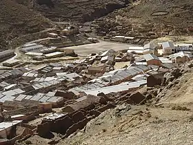 Tatasi is the most populous settlement in the canton of Portugalete and lies in the district (Bolivian : Municipio) Atocha in the province of Sur Chichas.[1] The village is located at an altitude of 4065m in a high mountain depression on the irregularly flowing Río Tatasi, one of the source rivers of the Río Tupiza. Tatasi is framed by ridges that rise to an altitude of 4,460 meters, surrounding the town almost entirely. Almost three kilometers west of Tatasi is the uninhabited ghost village of Portugalete and the mining colony at the Tatasi-Portugalete Mine, which were abandoned in the 19th century after the silver mines there were exhausted and the mining colonies there moved on.[2]