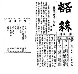 Tattler (Chinese: 语丝; pinyin: Yǔsī; lit. 'Language Thread') was an important Chinese weekly journal founded in 1924 and very influential in the establishment of the new literature in China. It later changed into a semi-monthly and finally ceased publication in March 1930. It fostered a distinctive "Tattler literary style" (语丝文体 ).
