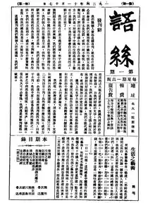 Tattler was founded primarily by Liang Yuchun 梁遇春, Zhou Zuoren, Lu Xun, Lin Yutang, Qian Xuantong, Yu Pingbo, Liu Bannong, and others. Sun Fuyuan 孙伏园 was the editor, but Lu Xun was actually the prime mover. The Beiyang Government shut down the magazine after its 153rd issue October 15, necessitating a move to Shanghai. The 154th issue was published in Shanghai with Lu Xun as editor.[1]