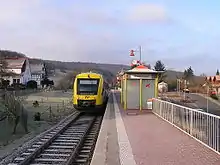 The continuation of the line, on the route of the original Solmsbach Valley Railway (Solmsbachtalbahn), climbs past the former Jägerhaus timber loading point, which was used in freight operations from 1913 to 1985 and for passenger traffic from 1954 to 1981, and immediately afterwards passes through the Hasselborn Tunnel, which passes through the border into the Lahn-Dill-Kreis. The 1,300 m-long tunnel lies on a slight incline and is almost straight. During the war, it was originally supposed to be used for the safe storage of the special trains of Adolf Hitler while he was in the nearby Adlerhorst. Due to the increasing air raids on Frankfurt around 1941, the VDM copper works at Heddernheim shifted parts of the war production here and used forced labourers, which is commemorated on a plaque near the south portal.[4] Shortly after the end of the tunnel is the new halt of Hasselborn which was moved from the old station about 100 metres closer to the village in 1999. Behind it, the line continues descending, until the final station is finally reached in Brandoberndorf, which is in the municipality of Waldsolms. It is located a few metres south of the old station. There are two unused sidings in the station area.