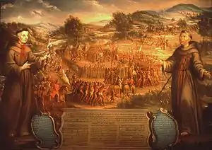 As French allies, the Taovaya ran afoul of the Spanish who had several posts and missions in southern Texas. In 1758, the Comanche, Taovaya, and other Wichita destroyed the San Sabá de la Santa Cruz mission of the Spanish. The next year the Spanish sent a 500-man army north to attack the Taovaya village at Spanish Fort, Texas. An Indian army met the Spaniards and routed them, capturing two cannons and killing or wounding about 50 of the Spaniards.[9] The unsuccessful Spanish attack on Taovaya villages in Texas and Oklahoma in 1759 is known as the Battle of the Twin Villages.