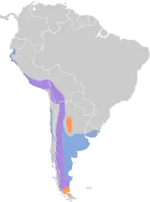 Subspecies O. r. pallidus of the tawny-throated dotterel has a limited range; it is found in coastal northern Peru only as far south as the Department of La Libertad. What is assumed to be this subspecies has been recorded as a vagrant in Ecuador. The nominate subspecies is found from southern Peru south through western Bolivia, Chile, and western Argentina into Tierra del Fuego and east through southern Argentina into Uruguay and southern Brazil. It has also been recorded as a vagrant on the Falkland Islands.[2][4][5]