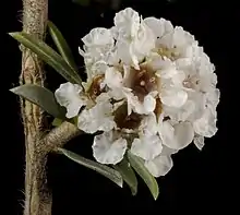 The shrub can grow to a height of approximately 2 metres (7 ft). It blooms from January to June producing white flowers. Found in water-logged low-lying areas, swamps and lake margins in the South West region of Western Australia where it grows in peaty sandy or clay soils.[1]
