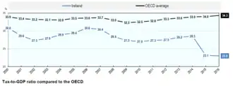 From 2000 to 2014, Ireland's Total Gross Tax[lower-alpha 1]-to-GDP ratio was 27–30%, versus the OECD average of 33%, and EU–27 average of 36%.[7] In October 2013, the Department of Finance Tax Policy Group, highlighted the distortion of Irish GDP impacted this metric, and Ireland's Tax-to-GNP ratio at 36% was above the OECD average, and in line with the EU–27 average.[8][27]
