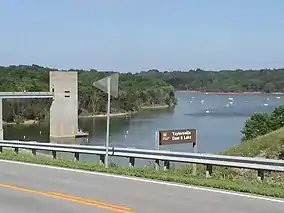 Taylorsville Lake gains its name from the nearby town, named for President Zachary Taylor's father, Richard Taylor, who donated 60 acres (24 ha) of his own land for creation of the town.[1] The lake was created when the United States Army Corps of Engineers chose to dam the Salt River, thereby creating the lake, with its public opening in January 1983. The dam, which measures a height of 163 feet (50 m) and a length of 1,280 feet (390 m), cost $28.8 million to build. The resulting lake is 3,050 acres (1,230 ha) in total area, has 75 miles (121 km) of shoreline, and is 18 miles (29 km) long.[3]