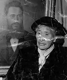![]() Te Heke-rangatira-ki-Nukutaurua Boyd in front of a painting of her grandfather, Hoani Te Rangitakaiwaho, by Gottfried Lindauer | |
