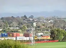 Te Rapa railway station opened when the North Island Main Trunk was extended from Ngāruawāhia to Hamilton on 19 December 1877. Te Rapa is at the northern end of the section to Palmerston North, electrified in 1988. Electrification ends just north of the 545 km (339 mi) post (distance north of Wellington).[24] A locomotive depot and marshalling yard incorporated the Racecourse station site. There is also a concrete sleeper factory at Te Rapa.[25]