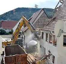 A teardown is the demolition for replacement of a home or other building that was recently purchased for that purpose.[1] Frequently, the new building is larger than the previous one. Reasons for developers to tear down can include increasing the appeal of the property to prospective buyers or taking advantage of rising property values.[2] The process is common in older suburbs, where people wish to have larger homes, and yet do not want to move to distant exurbs or new developments.