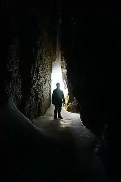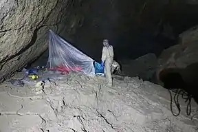 Tears of the Turtle Cave is located in the Bob Marshall Wilderness in western Montana and is currently the deepest known limestone cave in the United States since passing New Mexico's Lechuguilla cave in 2014.[3] As of August 2022, the cave is known to be 2,052 feet (625 m) deep[2] and 1.488 miles (2,395 m) long.[1] The cave consists mostly of narrow fissure passage passing over approximately 50 short rope drops. With a mean temperature of 37 °F (3 °C) it is muddy and poorly decorated.[4]