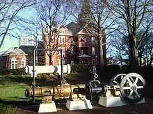 As the oldest building on the Georgia Tech campus, Tech Tower has accumulated a number of peripheral monuments and sites of interest over the years. Two walkways encircle the building, including the Tower Walk, donated by the Class of 1950 in 2000.[26][27][28] Georgia Tech's first class memorial, a marble drinking fountain, was donated in 1911 by the Class of 1903 and is situated east of Tech Tower's main entrance.[29] Also near the main entrance to Tech Tower is a marbled pair of benches donated by the Class of 1925 in memory of those who died in World War I.[30] A few feet away stands a marbled bench memorial to Paul Howes Norcross, a 1902 Georgia Tech alumnus and former ASCE president who perished in the Norman boat disaster of May 8, 1925.[31] The headstone of Sideways the dog is located near Tech Tower's rear entrance,[32][33] as is an informational placard detailing Tech Tower's early history, donated by the Class of 1932.[34] A staircase donated by the ANAK Society in 1921 connects Tech Tower to the adjacent D. P. Savant Building via a continuous sidewalk.[35] Finally, a steam-driven air compressor, colloquially known as the "steam engine," sits prominently at the top of the hill near Tech Tower as a reminder of the school's industrial roots.[2][3]