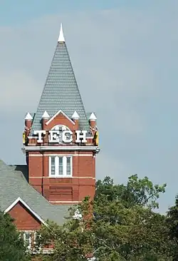 Tech Tower is built in the Victorian style with Romanesque Revival influences. The building's original specifications, according to Georgia Tech's first Annual Catalogue Announcement published in 1889, are listed as 130 ft (40 m) wide and 120 ft (37 m) deep.[9] It is constructed primarily of red brick and trimmed with granite. The gabled roof, originally terra cotta, was later replaced by copper shingles.[16] The main complex of the building stands four stories high plus a basement. The tower portion stands seven stories high and is topped with four lighted TECH signs (one on each side) and a high pitched roof. The main entrance to the building is accessed by ascending a small staircase and entering a small porch which forms the base of Tech Tower. Most of the building's windows are simple rectangular frames, with the exception of those on the third floor, which are arched. The entire complex sits on the crest of a tree-dotted hill, giving it the appearance of being larger than it actually is.[21]