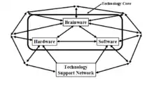 These three components form the technology core. The components of the technology core are co-determinant, their relations circular and mutually enhancing.