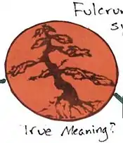 Left: What appears to be an uprooted bonsai tree next to the notes "Fulcrum symbol?" and "True meaning?"