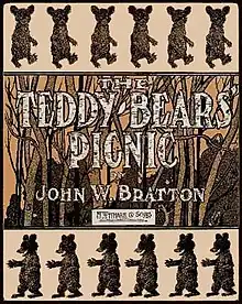 Bratton composed and personally copyrighted it in 1907, and then assigned the copyright to M. Witmark & Sons, New York City, who published it later that year as "The Teddy Bears Picnic: Characteristic Two Step", according to the first page of the published piano score, as well as the orchestral parts Witmark published in an arrangement by Frank Saddler. However, the illustrated sheet music cover gives the title as THE TEDDY BEARS' PICNIC, with apostrophe on "BEARS" and no genre descriptor.[1][2] Irish songwriter Jimmy Kennedy wrote the now familiar lyrics for it in 1932.