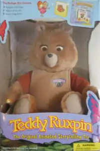 Teddy Ruxpin is an animatronic children's toy in the form of a talking 'Illiop', a creature which looks like a bear. The toy's mouth and eyes move while he reenacts stories played on an audio tape cassette deck built into its back. While the character itself was created by Ken Forsse, the talking toy was designed and built by Forsse’s Alchemy II, Inc. employees, including Larry Larsen and John Davies.[4] Later versions have a digital cartridge in place of a cassette.[5]