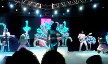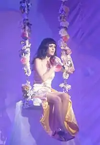 While promoting the album, Perry expressed she wanted her upcoming tour to be very visual. On her Twitter account, she stated, "I hope that it's going to engage all of your senses: sight, sound, smell, taste, touch".[87] The California Dreams Tour was officially announced in October 2010 by various media outlets including Perry's official website, in conjunction with the release of her third single, "Firework". In 2011, Perry announced her North American leg during a live chat on social network Facebook. She then responded the tour will be very "super girl power" as vocalists Robyn, Yelle and Marina and the Diamonds will open her shows during the various legs. Perry further stated she will actively participate with fans during the tour on various social networks including Facebook and Twitter.[88] The tour beginning February 20, 2011 on Lisbon, Portugal and the end January 22, 2012 on Pasay, Philippines, the tour visited Europe, Oceania, Asia and the Americas.[89] The tour ranked 16th in Pollstar's "2011 Top 25 Worldwide Tours", earning over $59.5 million.[90] At the conclusion of 2011, the tour ranked 13th on Billboard's annual "Top 25 Tours", earning nearly $50 million with 98 shows.[91] It won an award for Favorite Tour Headliner at the 38th People's Choice Awards.[92] On November 24, 2011, Perry had tweeted that there will be a concert DVD released for the tour.[93]