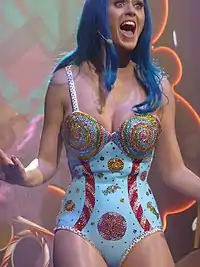 The album opens with the title track and second single "Teenage Dream", which is written as a throwback record to Perry's teenage years.[31] It is a power pop and electropop song which features a "distinct retro sound",[32][33][34] and contains influences of disco, pop rock, and industrial music.[27][35][36] The song has been compared to several disco artists, including Madonna and the Cardigans.[37] The second song is "Last Friday Night (T.G.I.F.)", the song recalls a true experience that Perry had while partying in Santa Barbara which included streaking in a park, dancing on tables, and partying at a club.[38] Musically, the song is styled in the genres of disco, indie rock, and Hi-NRG,[26][39][40] while also taking influence from dance-pop.[41] The lead single, "California Gurls", continues the "retro sound" carried from "Teenage Dream", and is written as an answer song to "Empire State of Mind" by Jay-Z and Alicia Keys, and pays tribute to the beach lifestyle of California.[32][42] The song utilizes the genres of disco, funk-pop, and electropop,[24][25][43] while bearing influence of new wave music within its composition.[25][35][44]