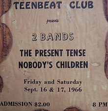 Notable Los Angeles bands which played at the Teenbeat Club included Love with Arthur Lee (with Scatter Blues as their opening act, December 31, 1967), the Peanut Butter Conspiracy (December 29-31, 1967),[31] and Hamilton Streetcar. The Standells also performed in 1966.[4][32]